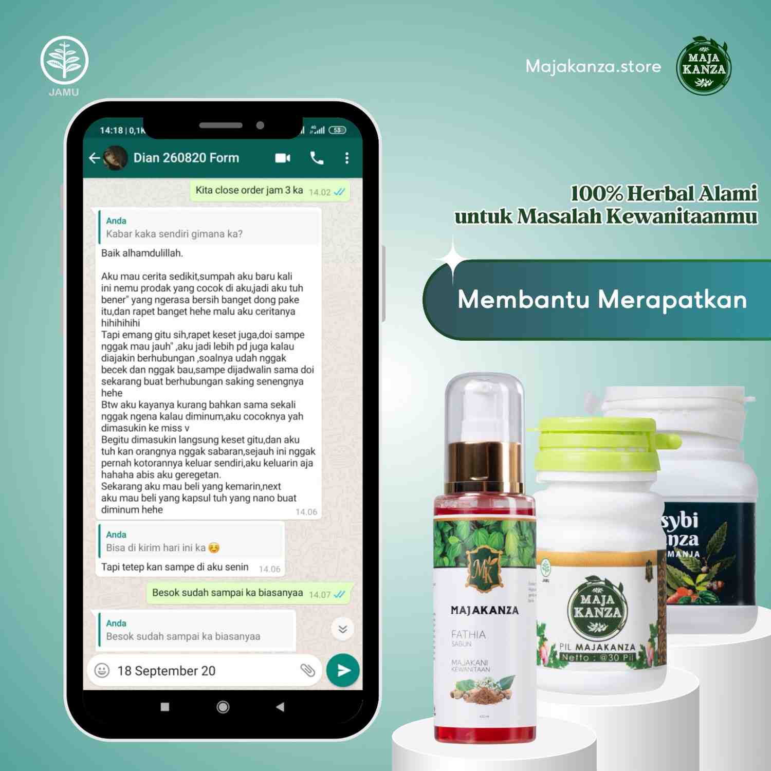 Majakanza adalah formula rahasia turun-temurun yang kini diramu modern, agar: Miss V lebih kesat, rapat, dan nyaman, Reaksi cepat, tanpa perlu banyak waktu, Meningkatkan keintiman & chemistry suami istri, Bisa dipakai rutin setiap 3 hari sekali